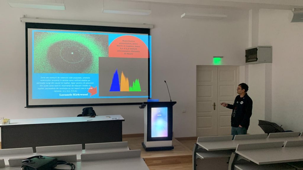De asemenea, o altă prezentare a fost făcută studenților de la Facultatea de Matematică și Informatică din cadrul aceleași universități, acolo unde am fost invitați de doamna profesoară Nicoleta Voicu. Am discutat despre cum a fost măsurat Sistemul Solar în antichitate și nu numai: circumferința Terrei a fost calculată folosind un băț, distanța până la Lună, observând eclipsele.