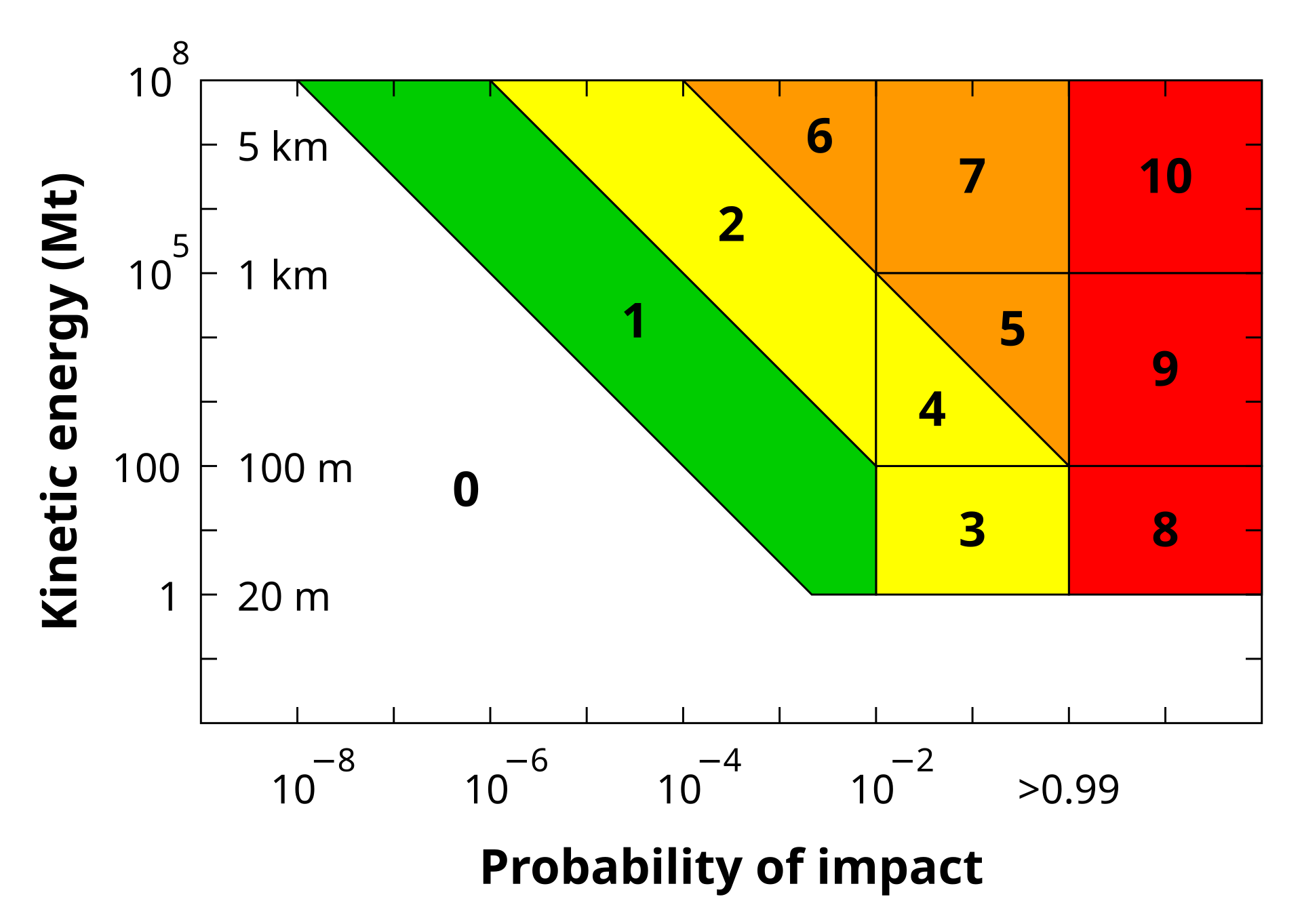 9, O coliziune este sigură, capabilă de a provoca devastare regională fără precedent pentru un impact pe uscat sau amenințarea unui tsunami major pentru un impact oceanic (roșu). Astfel de evenimente au loc, în medie, o dată la 10.000 de ani până la o dată la 100.000 de ani.