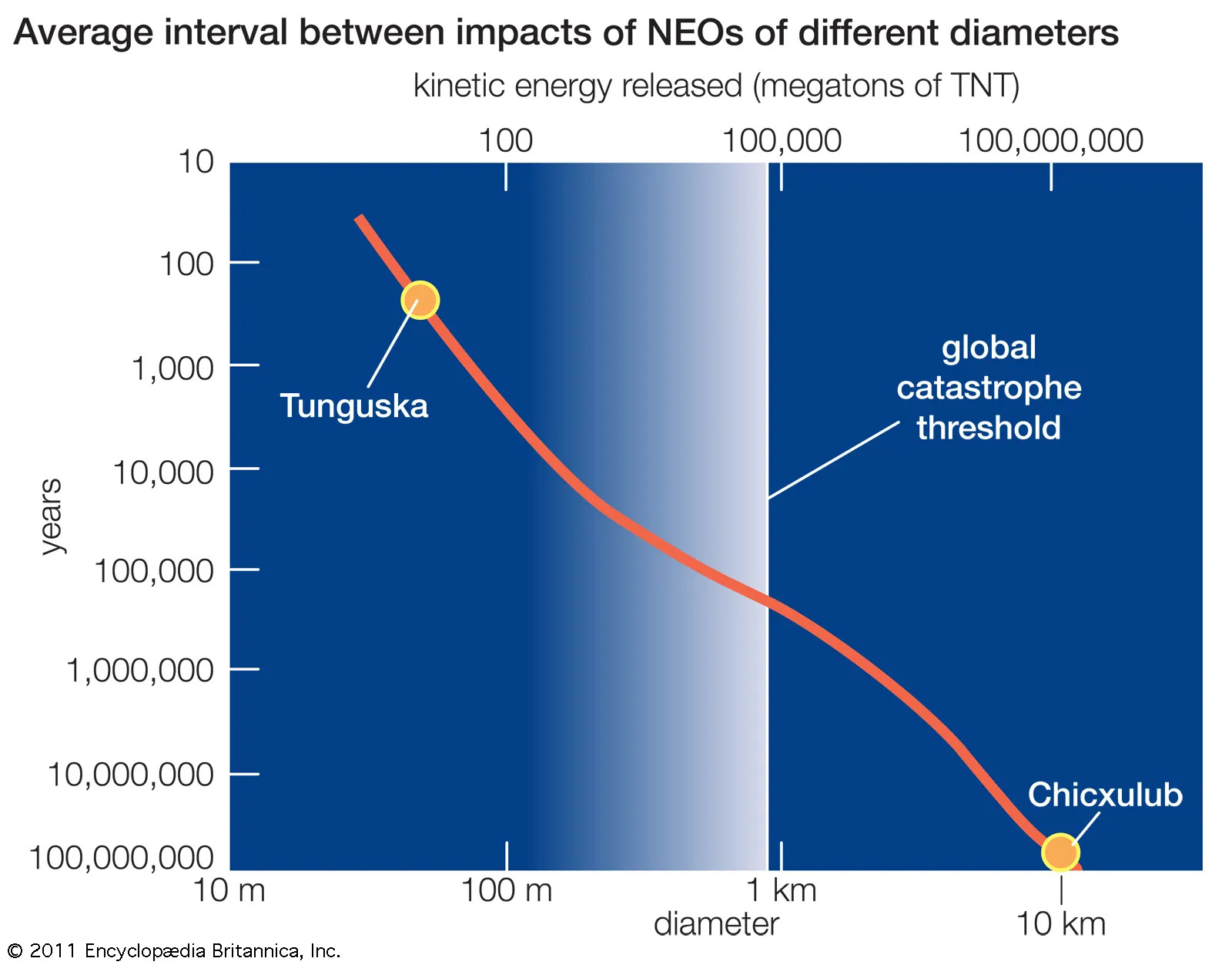 Se estimează că un impact cu un NEO cu diametrul de 1 km, cel mai mic considerat capabil să cauzeze o catastrofă, are loc în medie o dată la peste 100.000 de ani, bazat pe populația de astfel de obiecte aflate în spațiu. Pe de altă parte, se estimează că un impact cu un NEO de 100 de metri, cel mai mic considerat capabil să provoace o devastare regională, are loc în medie o dată la 1.000 – 2.000 de ani. Coliziunile mari – cu obiecte de 5 km – se întâmplă aproximativ o dată la douăzeci de milioane de ani. Ultimul impact cunoscut al unui obiect cu diametrul de 10 km sau mai mare a avut loc în timpul evenimentului de extincție Cretacic–Paleogen acum 66 de milioane de ani. Impactul Chicxulub a fost estimat la 100 milioane (108) megatone sau scara Torino 10. Până la următorul asemenea impact ar trebui să treacă sute de milioane de ani.