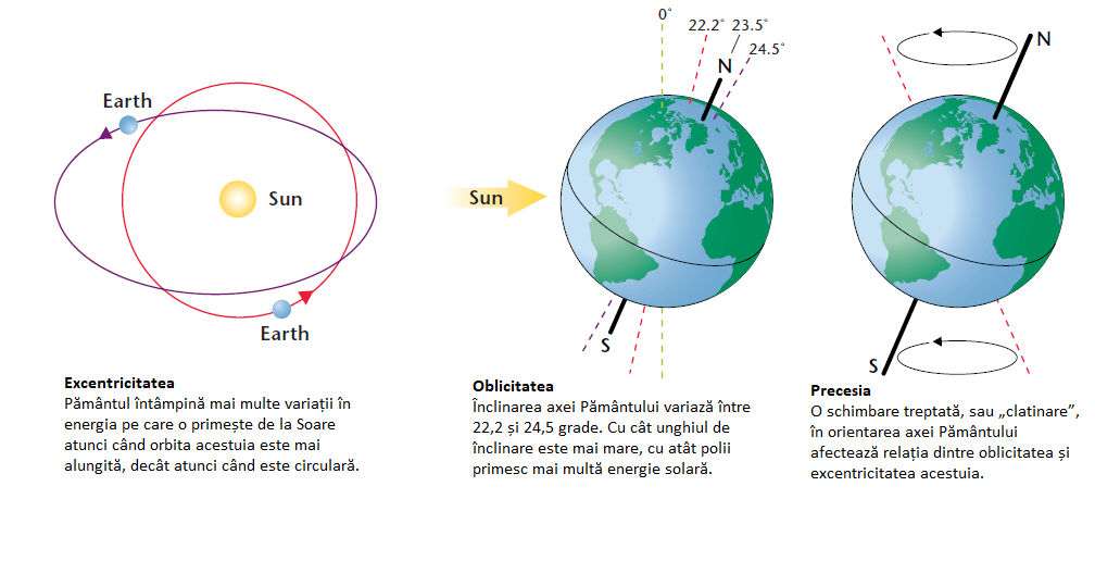 Ciclurile lui Milanković sunt centrate pe trei parametri legați de mișcarea Terrei: excentricitatea, oblicitatea axei de rotaţie și precesia axei planetare. Cei trei termeni descriu forma orbitei Pământului (dacă ea este mai circulară sau mai eliptică), înclinarea axială a planetei noastre în raport cu orbita sa, dar și clătinarea axei de rotație planetare.